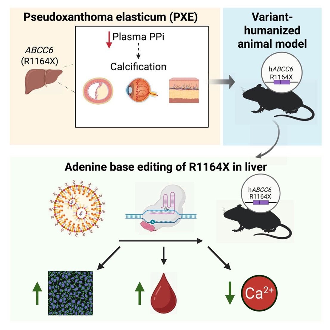 - We developed an LNP-based adenine base editing therapy to correct the recurrent human ABCC6 c.3490C>T (p.R1164X) variant in the liver of variant-humanized mice