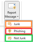 The email protection system leverages a New Report Button. Depending on how you access email, you will now see one of these buttons to report mail: